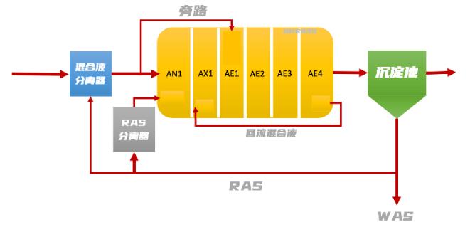 該廠設計規模為1817m3/天,實際日平均流量卻高達2080m3/天,進水的碳質生化需氧量(cBOD5)平均值為95mg/L。如上圖所示,進水(RAW)和回流污泥(RAS)先進入厭氧池,再進入缺氧池,硝態氮回流液會通過好氧池的末端進入缺氧區,硝態氮在缺氧區進行反硝化反應。這樣的設計有個優點:便于調節曝氣控制和混合液循環控制。