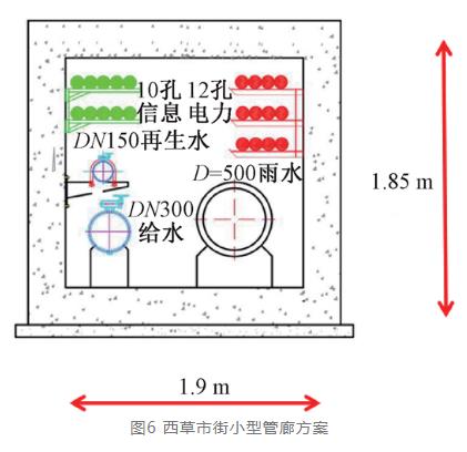 該方案將給水、雨水等給排水管道納入小型管廊中,充分體現了小型管廊廣泛的適建性。當老舊城區內胡同雨水匯水面積較小、污水排水量可控的情況下,在上下游高程不會造成小型管廊覆土過深(一般不大于2m)時,雨水、污水均可以管道方式納入小型管廊內,實現老舊城排水分流。日本東京和德國法蘭克福等城市均有排水管道入廊的成功案例。