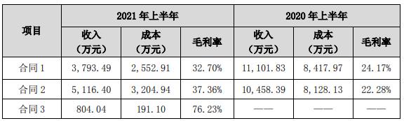 a.公司承接的海水淡化業務——合同 1、2 兩個項目,合同簽訂時間為 2019年下半年,簽訂后開始進行系統設計,大約 2020 年年中設計工作告一段落,之后開始采購。由于此項目處理規模非常大,按施工順序,先將土建施工段中需要預埋的管道、管件,經過特殊加工的材料送到現場,配合土建施工,再進行核心設備的生產、供貨。2020 年上半年的綜合毛利率為 23.26%,本報告期內綜合毛利率為 35.38%。報告期內毛利率上升的主要原因為 2021 年上述項目出口交付的產品不同:2020 年上半年公司交付的設備主要為預埋管道及管件、輔材等,交付的產品來源主要為外購方式獲?。?021 年上半年交付的設備主要為氣浮水處理系統核心組件,本報告期內交付的主要核心組件是我司嘉興工廠自主生產。故2021 年上半年毛利率較去年同期有明顯增幅。