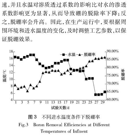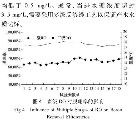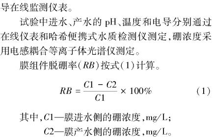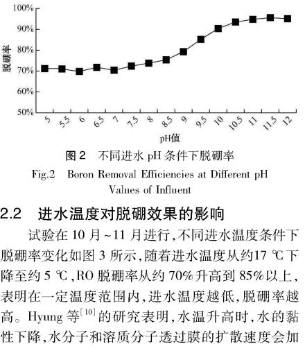 摘要:在海水淡化廠RO膜組上進行生產(chǎn)性試驗,探究pH、溫度、多級反滲透和膜組件等因素對RO脫硼效果的影響。試驗結(jié)果表明,進水pH值在8.5-10.5,RO脫硼率隨pH增大而州高,可以達到95%左右;隨著進水溫度從約17℃下降至約5℃,RO脫硼率從約 70%升高到 85%以上;在試驗條件下,二級RO 比例為45%,采用兩級RO工藝相對一級RO脫硼率高出約20%;不同品牌型號的RO膜在同等工藝和進水條件下,脫硼率存在較大差異,通過PEG處理性能下降的RO膜,一級RO脫硼率可以提高約15%。